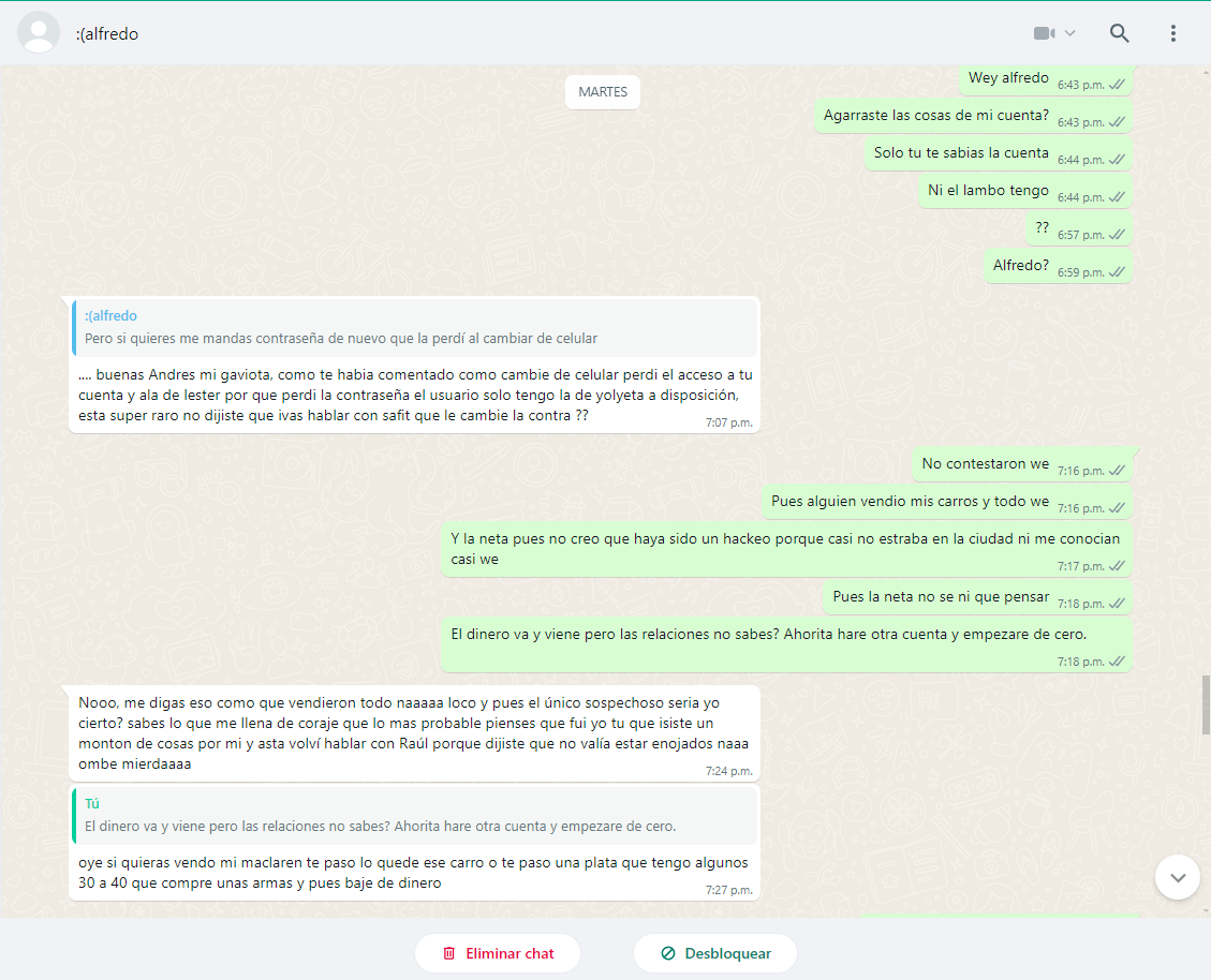 Cabe aclarar que desde el mes pasado son las únicas conversaciones que tuve con el y el subió algunas donde yo le estoy diciendo que es un plan que para inculparlo, el dinero de diamantes que gaste es lo de menos lo que de verdad me tomo por sorpresa y tristeza fue que haya traicionado mi confianza, cuando desde que el llego al servidor fui una de las personas que lo apoyo con dinero y trabajo dentro de la ciudad al igual que crear un rol para poder disfrutar como se debe este juego.