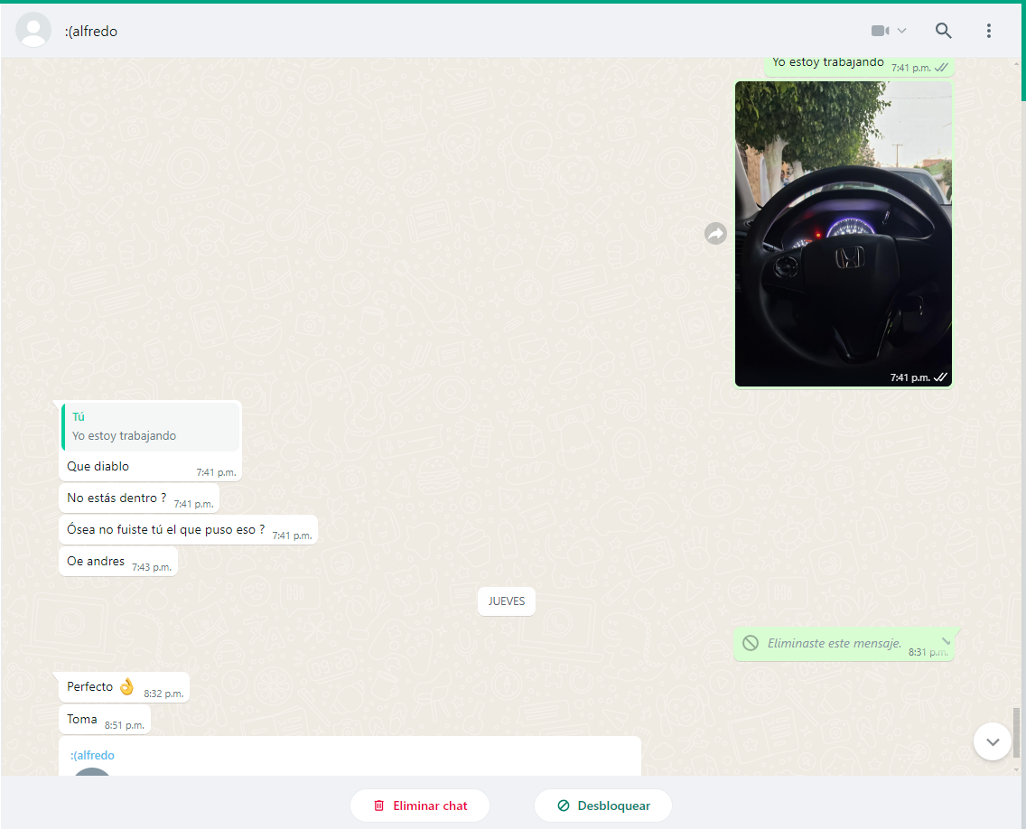 En la ultima captura de pantalla aparece que borre un mensaje ese mensaje era una captura que yo hice del mismo chat con el pero por error de dedo se lo envié a el mismo así que lo elimine nomas para aclarar si es que se lo preguntaron.