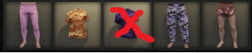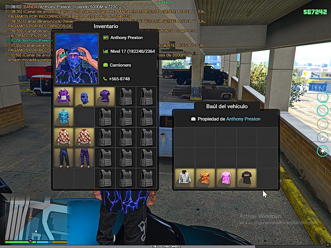 Me interesa la prendas morada camuflada, ahora te dejo la ropa que me queda para intercambiarCualquier de una de estas prendas del baul, me avisas por acá o me hablas al discord.
