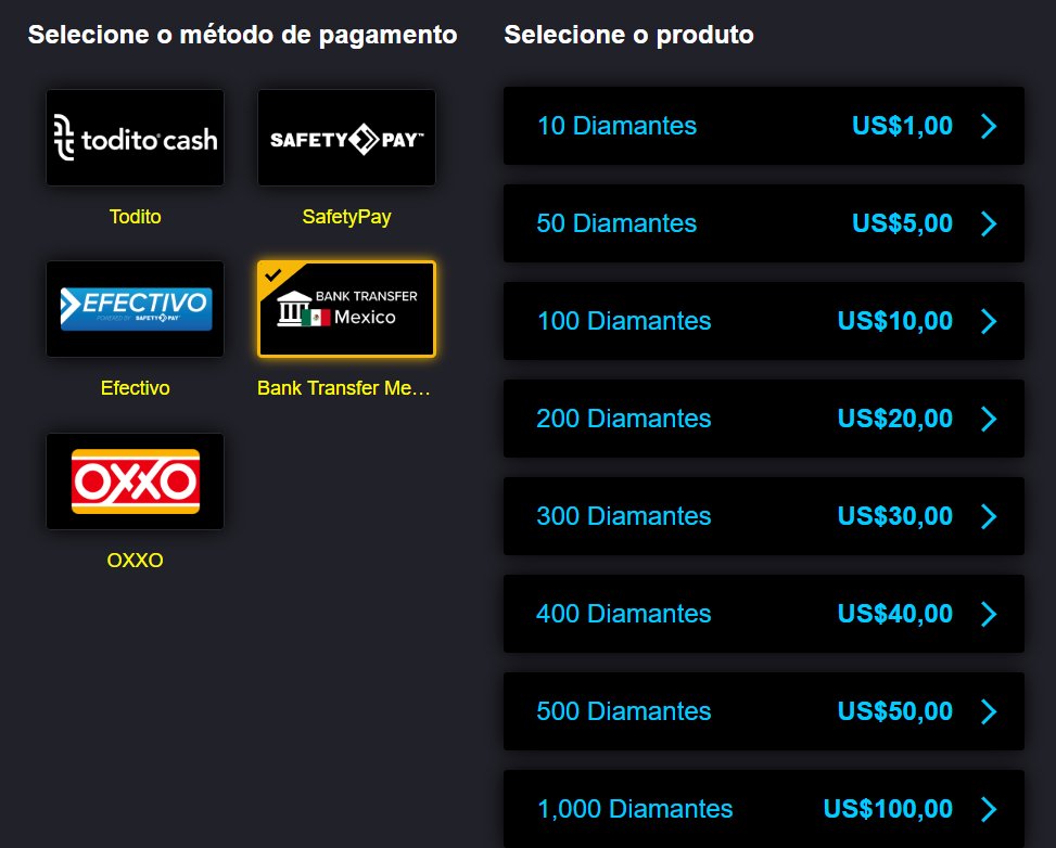 Hola, buenas noches, mi sugerencia es muy sencilla, hay algunos paises que no tiene una gran cantidad de diamantes para recargar, como Brasil(mi pais), Colombia, Peru, mientras eso hay otros paises con una buena cantidad de diamantes en venta como, argentina (hasta 1,000 diamantes), Mexico (hasta 1,000 diamantes)