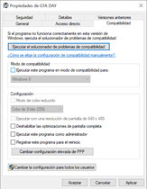 • Presiona click derecho al icono del acceso directo de GTA DAY y le darás en propiedades, luego se te abrirá este menú en la pantalla, revisa la casilla de compatibilidad si está desactivada: