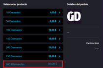 Como sugerencia me gustaría que agregaran otra opción al comprar diamantes para los que recargamos en más cantidad así no hacemos el mismo procedimiento varias veces algo así: