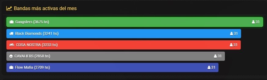 Buenas a toda la comunidad. Paso a sugerir a administración la implementación de estadísticas en el panel de banda (como se observa en la imagen de abajo) para ver a los usuarios más activos en cada banda, de modo que los jefes lleven un registro. Quizás sirva dentro de las organizaciones para premiar a aquellos más activos.