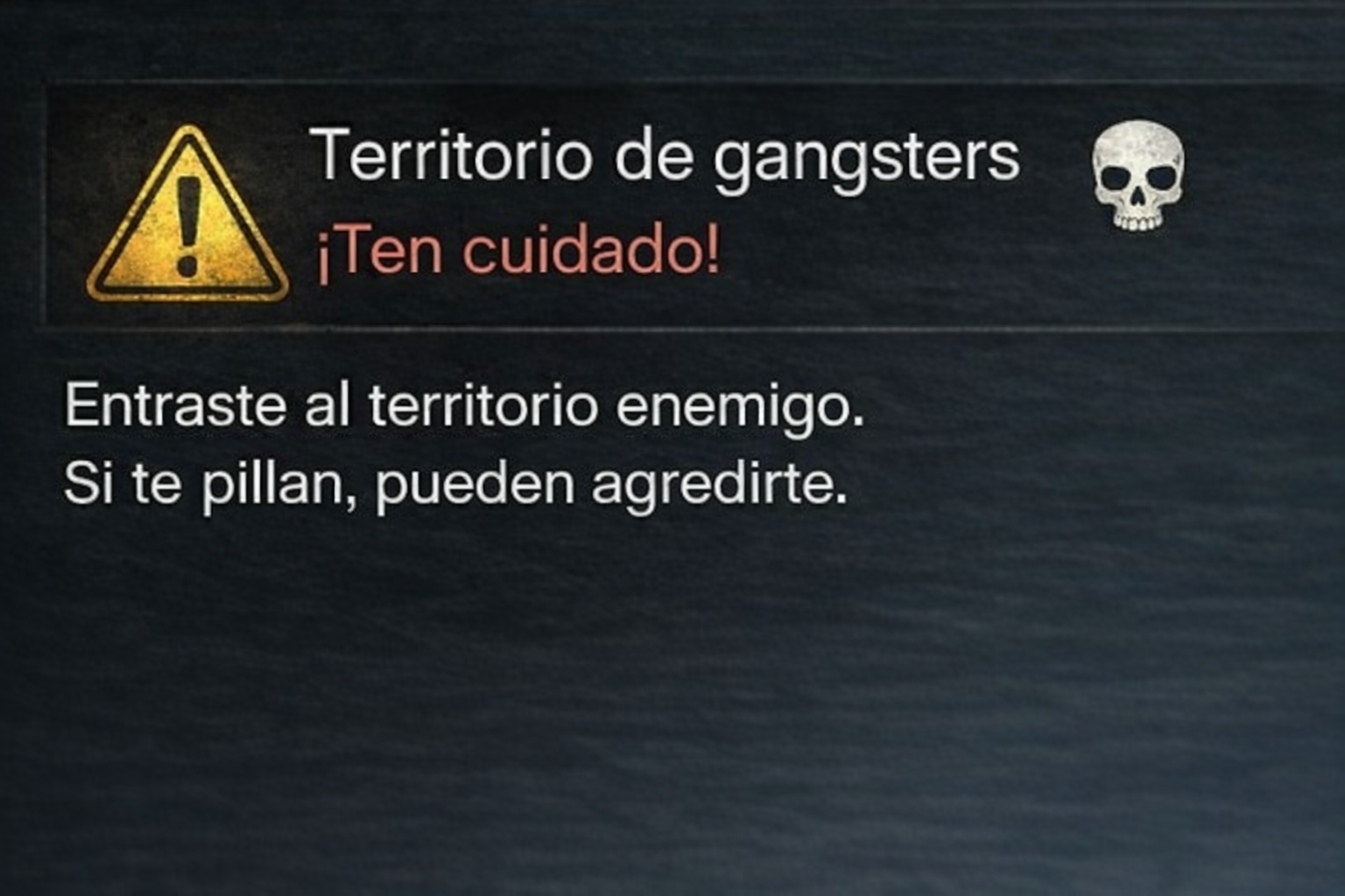 Al entrar a uno de estos territorios, Se mostrará un anuncio arriba del minimapa, Indicando que el jugador ha ingresado a una zona hostil, Con una advertencia clara del peligro que corre.