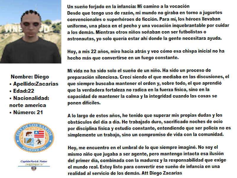Hoy, me encuentro en el umbral de lo que siempre imaginé. No soy el mismo niño que jugaba a ser agente, pero mantengo intacta esa ilusión del primer día, combinada con la madurez y la responsabilidad que exige el mundo real. Estoy listo para convertir ese sueño de infancia en una realidad al servicio de los demás. Att Diego Zacarias