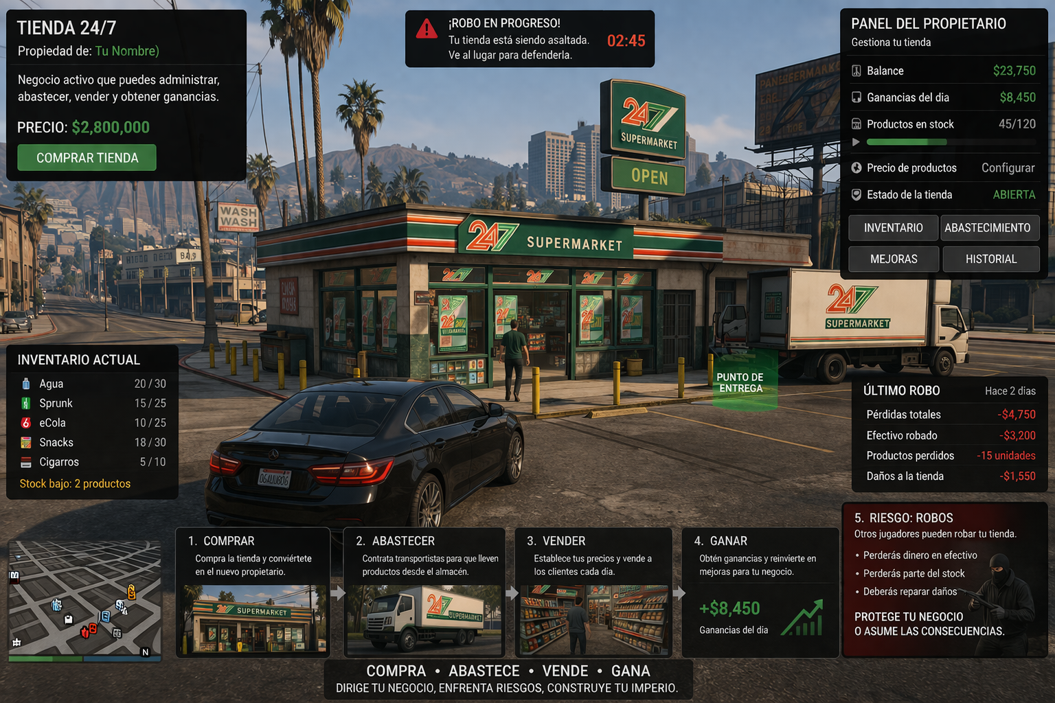 La presente sugerencia propone la implementación de un sistema completo de supermercados (24/7 y similares) que puedan ser adquiridos y gestionados por jugadores, integrándose directamente con sistemas ya existentes del servidor, como el trabajo de transportista.