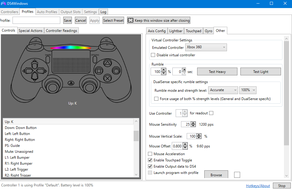 Haciendo énfasis en esta parte para mencionarles que el cuadro que está al lado del número 5 es para poner los colores en Rainbow o no. También se aprecia el apartado de ´´Pulse at´´ que también se puede cambiar a ´´Flash at´´ , esta parte es para indicarle al control que haga el efecto pulse o parpadee (dependiendo de tu elección) cuando la batería esté en ´´X´´ porcentaje de carga, así podrán darse cuenta que tan descargado está su control. Recomiendo ponerlo en 20%