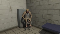 según mi deducción está sosteniéndose en dos manos sobre el inodoro pero a saber que esté haciendo